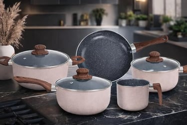 Conjunto Jogo de Panelas Antiaderente 5 Peças Com Tampa Revestimento Interno Antiaderente Bege e Cinza Inclui Frigideira Caçarola Panelas Leiteira Linha Gourmet